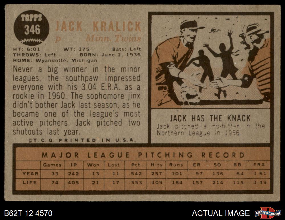 1962 Topps #346 Jack Kralick 4 - VG/EX