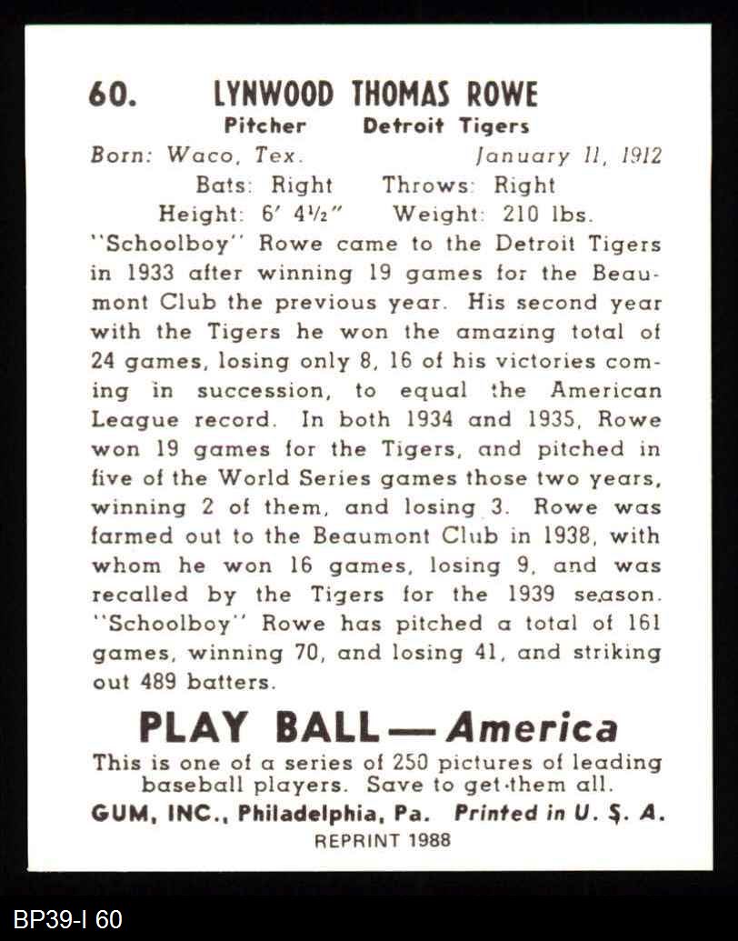 1939 Play Ball Reprint #60 Schoolboy Rowe 8 - NM/MT