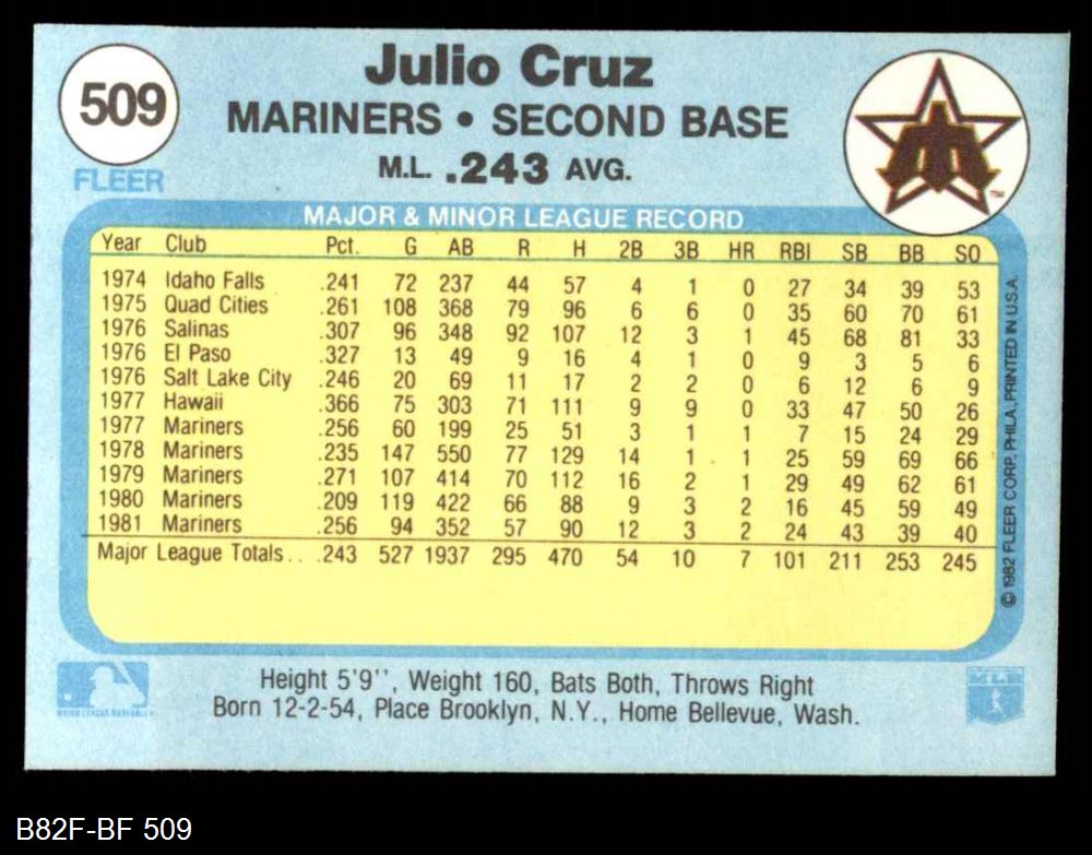 1982 Fleer #509 Julio Cruz 8 - NM/MT
