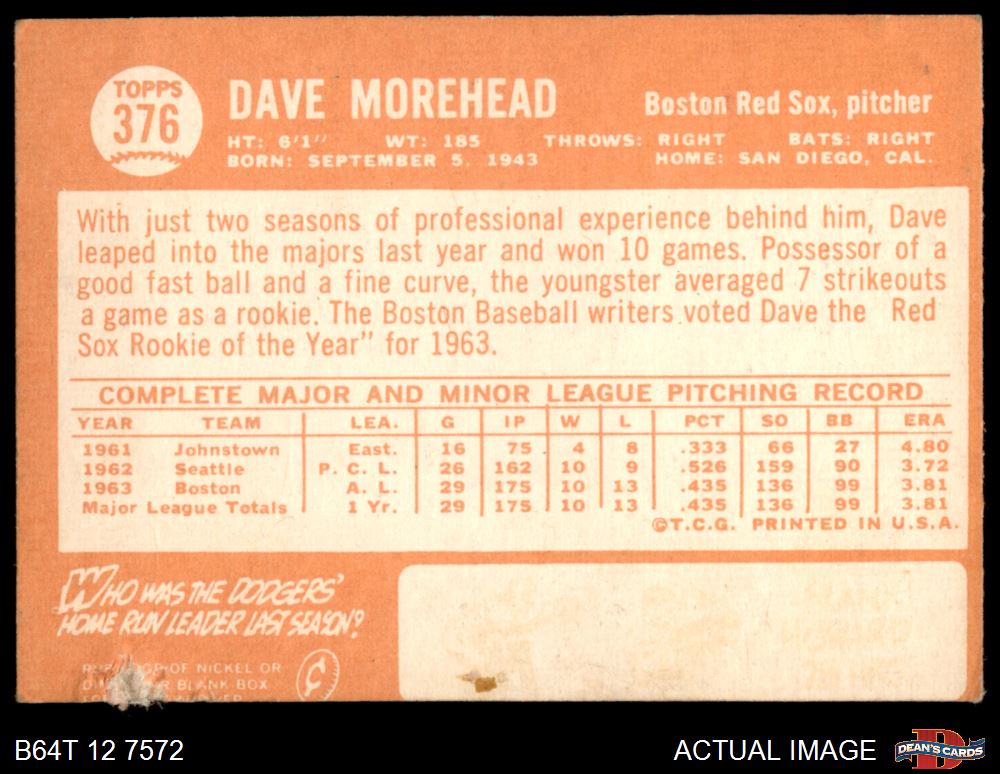 1964 Topps #376 Dave Morehead 1.5 - FAIR