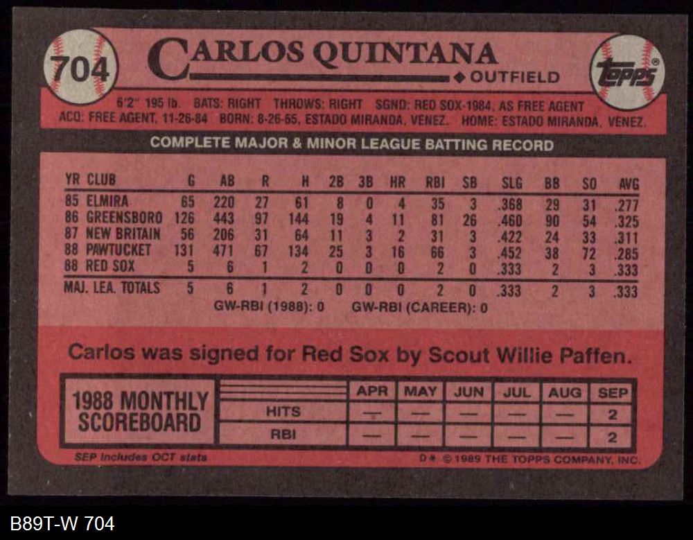 1989 Topps #704 Carlos Quintana 8 - NM/MT