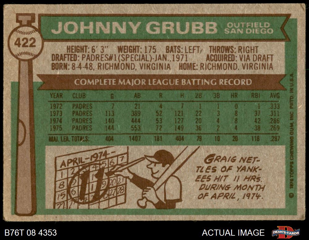1976 Topps #422 Johnny Grubb 3 - VG
