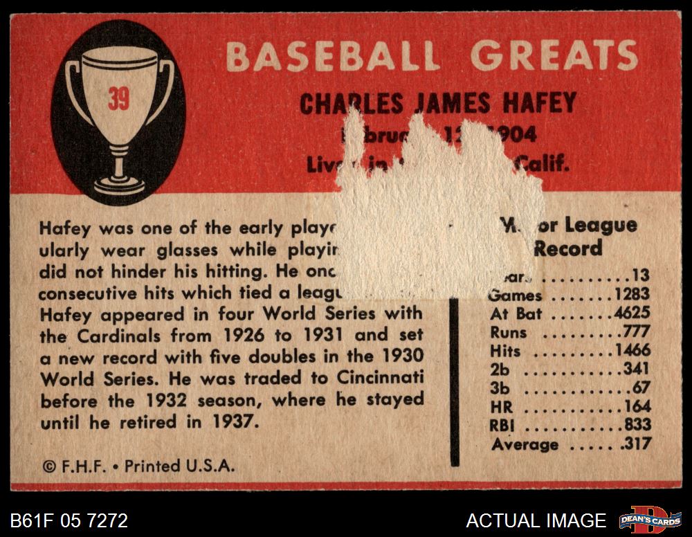 1961 Fleer #39 Chick Hafey