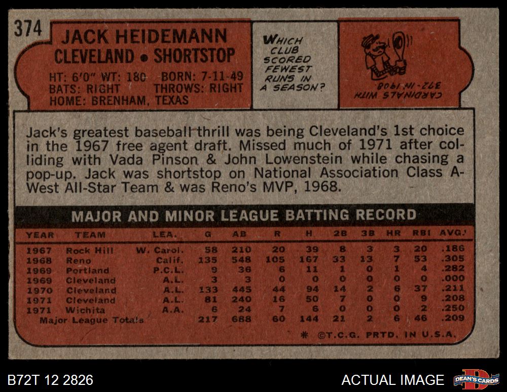 1972 Topps #374 Jack Heidemann 3 - VG