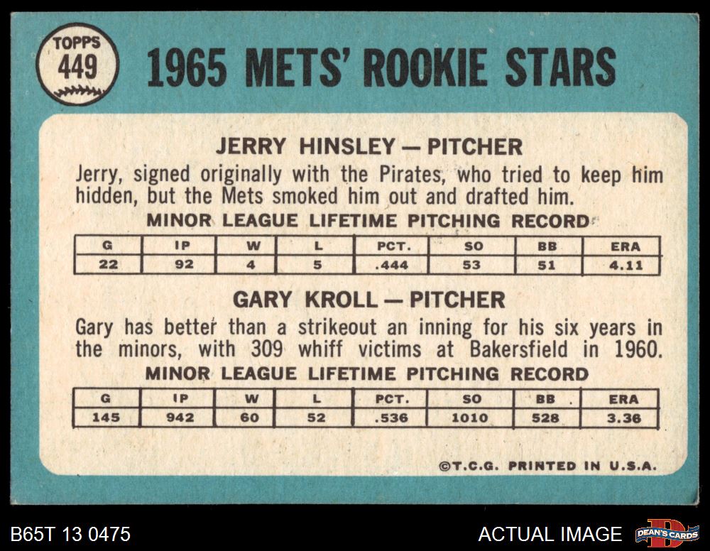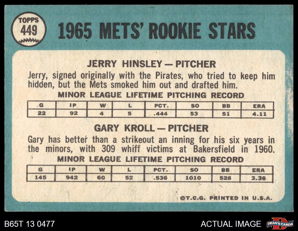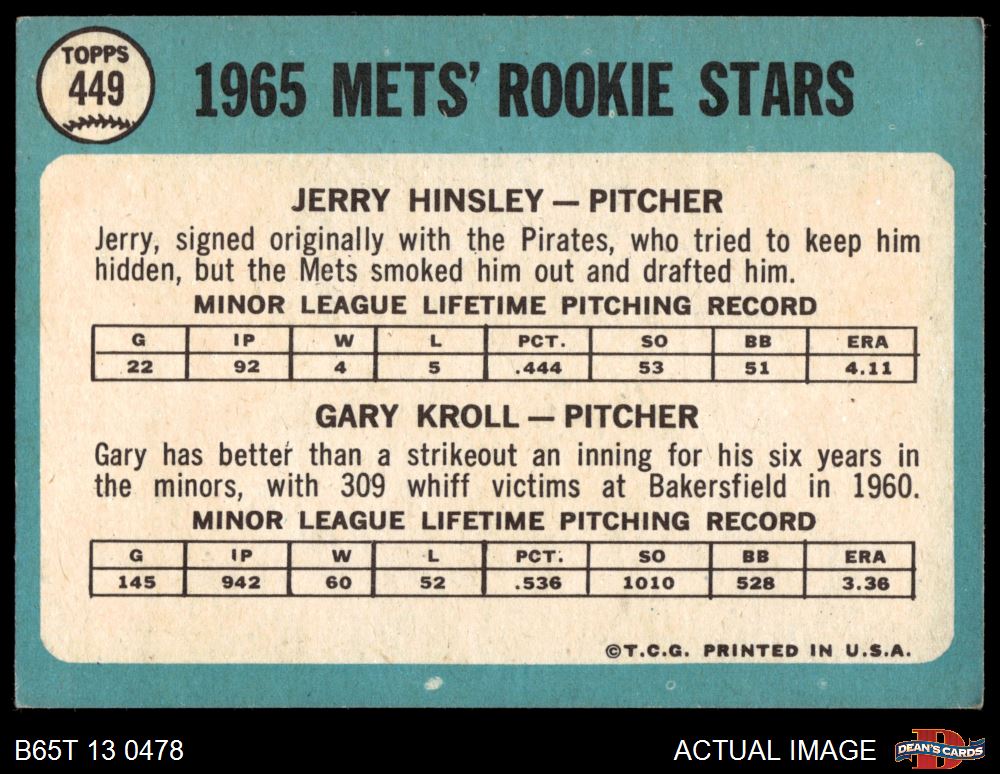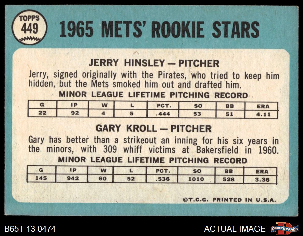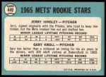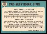 1965 Topps #449 - Jerry Hinsley / Gary Kroll Mets Rookies 4 - VG/EX