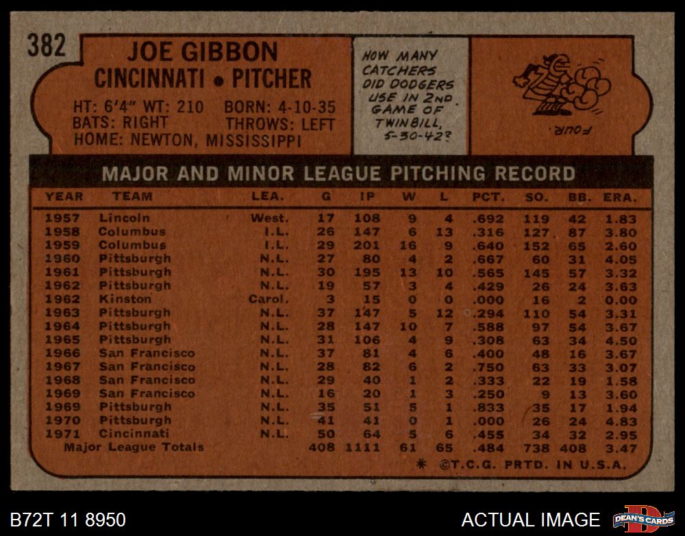 1972 Topps #382 Joe Gibbon 7.5 - NM+