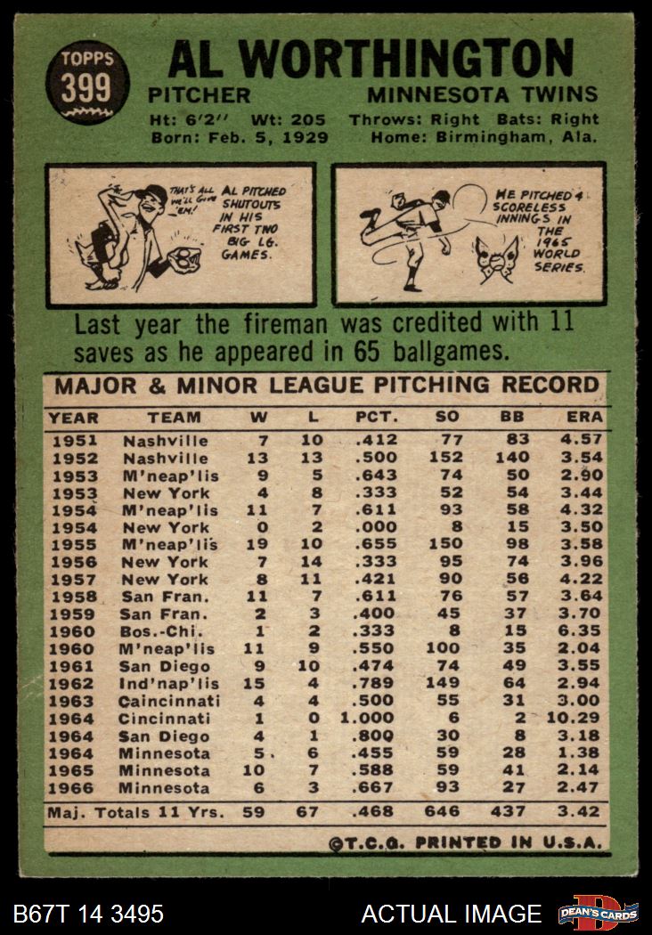 1967 Topps #399 Al Worthington 4 - VG/EX