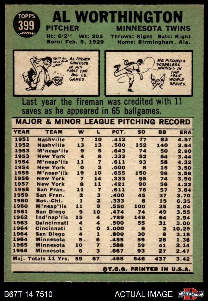 1967 Topps #399 Al Worthington 8 - NM/MT