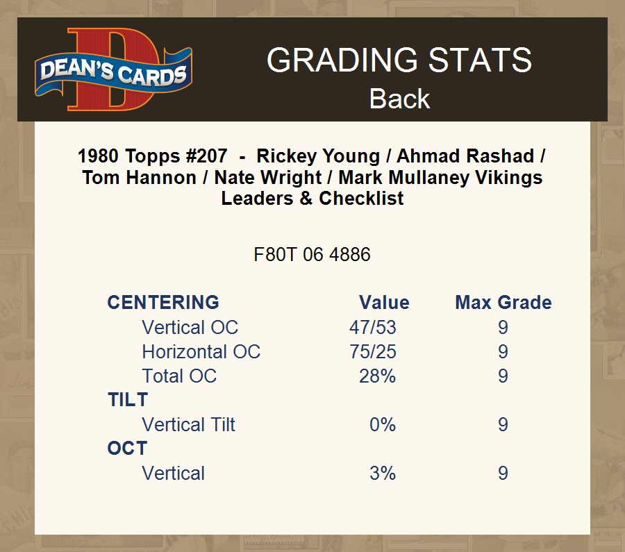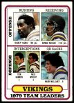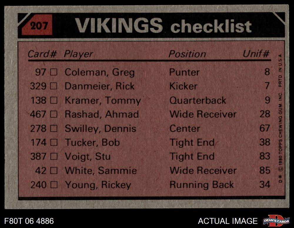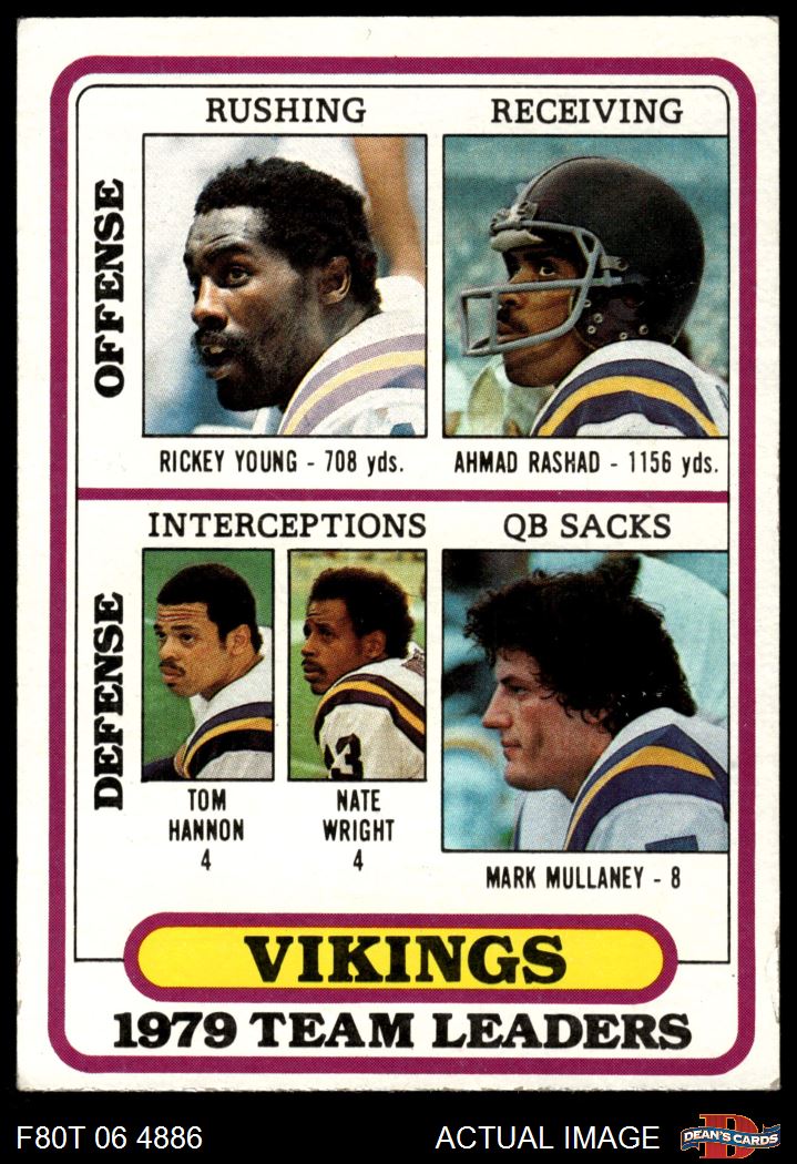 1980 Topps #207 - Rickey Young / Ahmad Rashad / Tom Hannon / Nate Wright / Mark Mullaney Vikings Leaders & Checklist 3 - VG