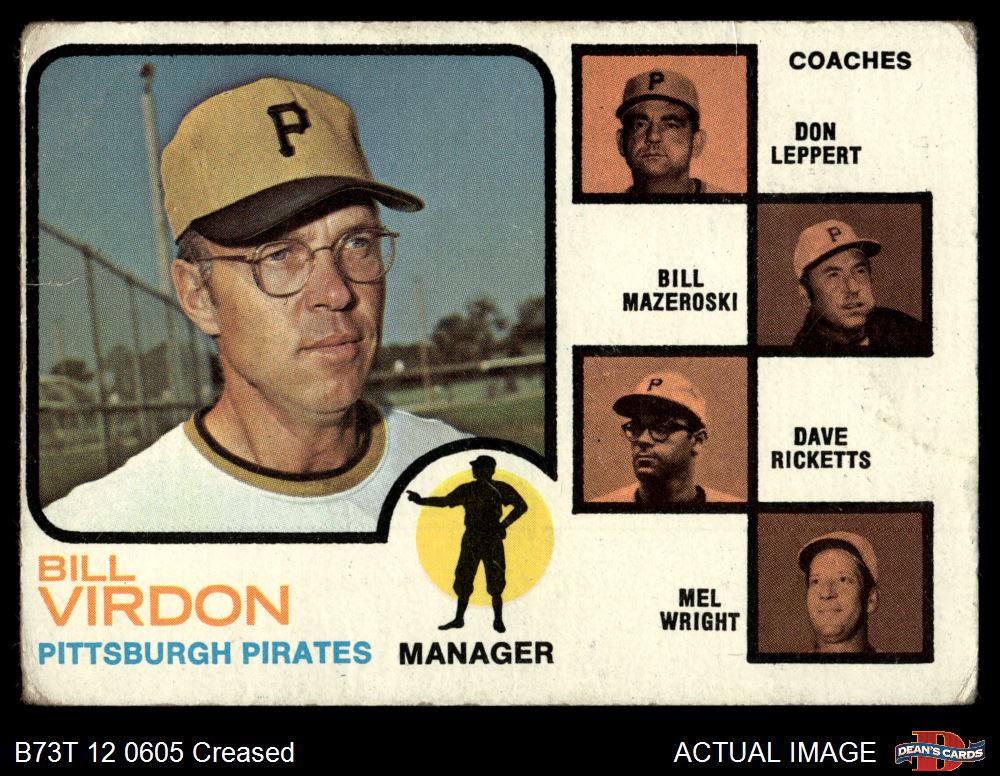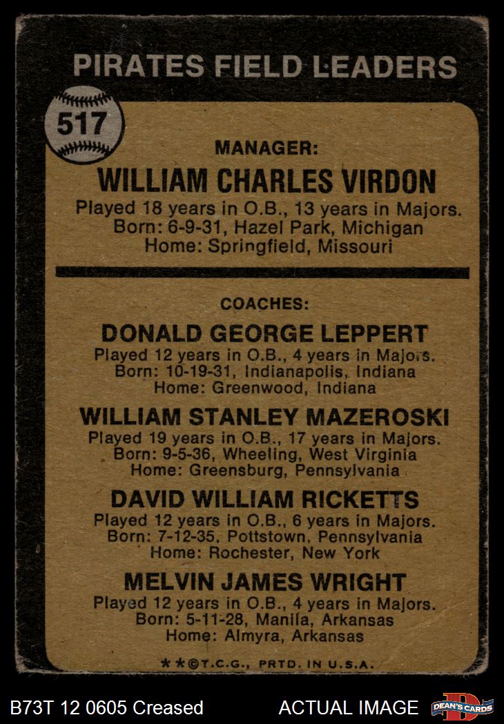 1973 Topps #517 EAR - Bill Virdon / Don Leppert / Bill Mazeroski / Dave Ricketts / Mel Wright Pirates Leaders 1 - POOR