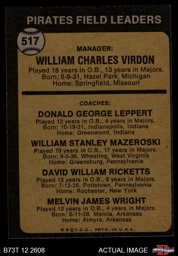 Bill Virdon / Don Leppert / Bill Mazeroski / Dave Ricketts / Mel Wright (19 available)