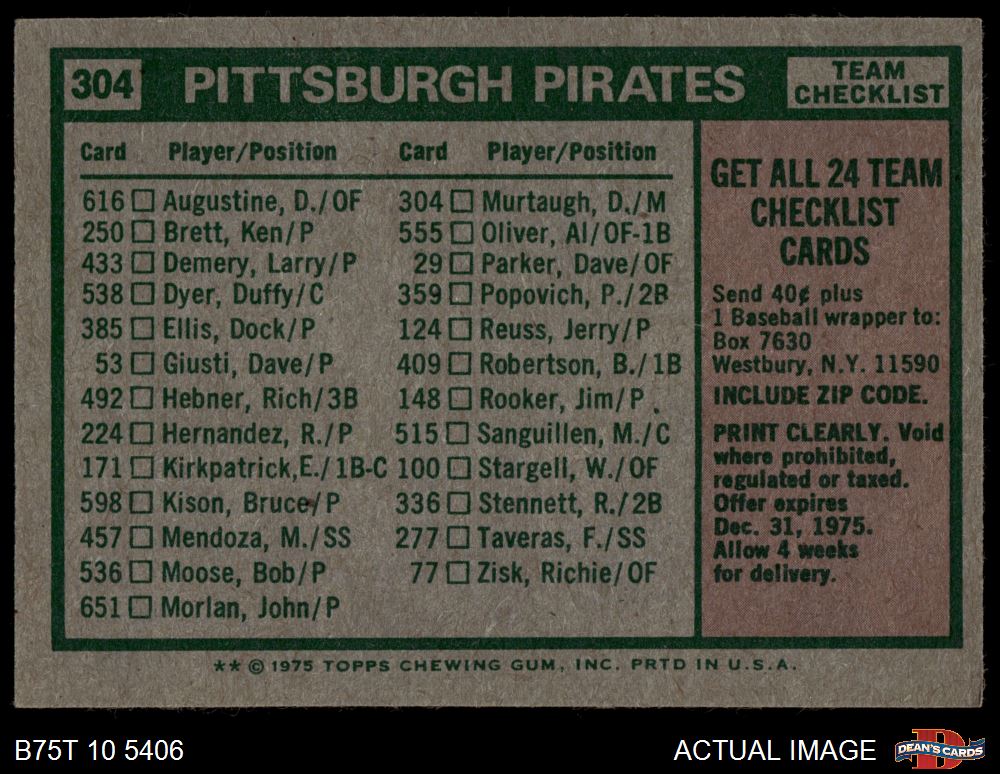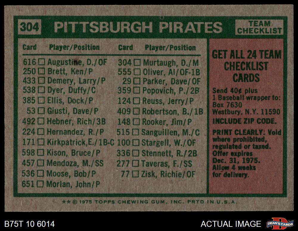 1975 Topps #304 - Danny Murtaugh Pirates Team Checklist 3 - VG