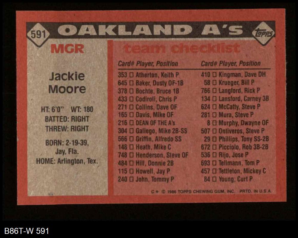 1986 Topps #591 - Jackie Moore A's Team Checklist 8 - NM/MT