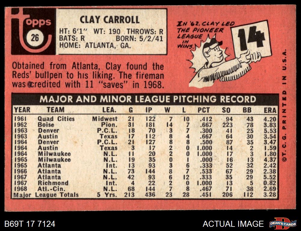 1969 Topps #26 Clay Carroll 2 - GOOD