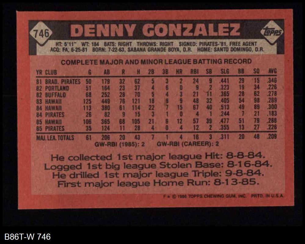 1986 Topps #746 Denny Gonzalez