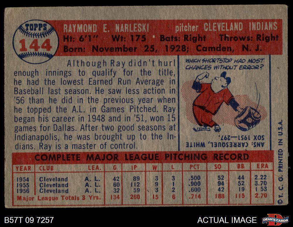 1957 Topps #144 Ray Narleski Front Thumbnail