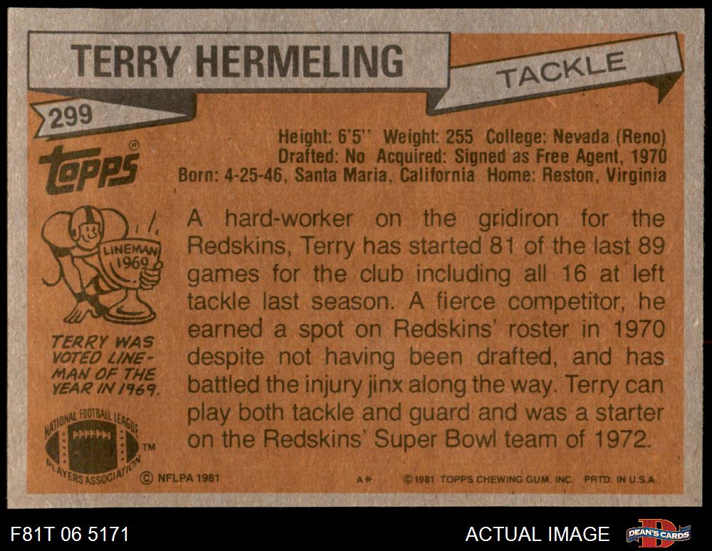 1981 Topps #299 Terry Hermeling 8 - NM/MT