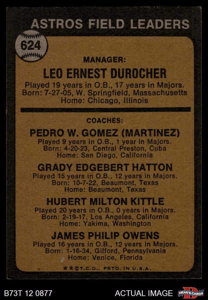 1973 Topps #624 - Leo Durocher / Preston Gomez / Grady Hatton / Hub Kittle / Jim Owens Astros Leaders 4.5 - VG/EX+