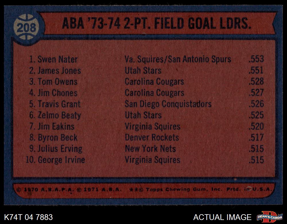 1974 1974 #208 - Tom Owens / James Jones / Swen Nater ABA Field Goal % Leaders 8 - NM/MT