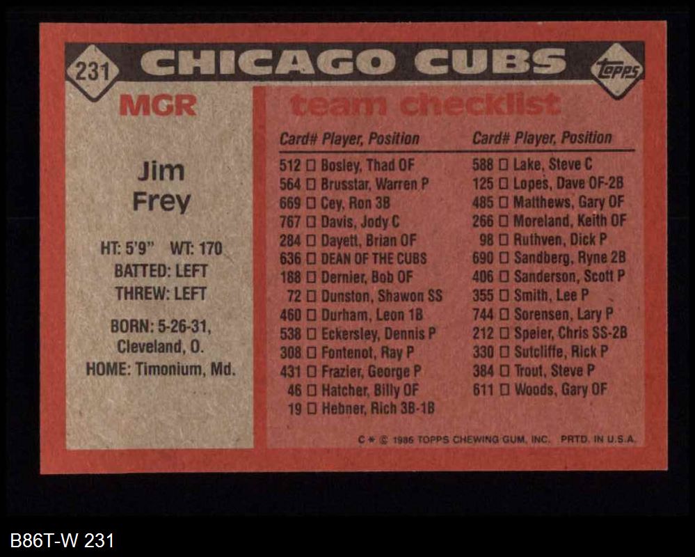 1986 Topps #231 Cubs Team Checklist
