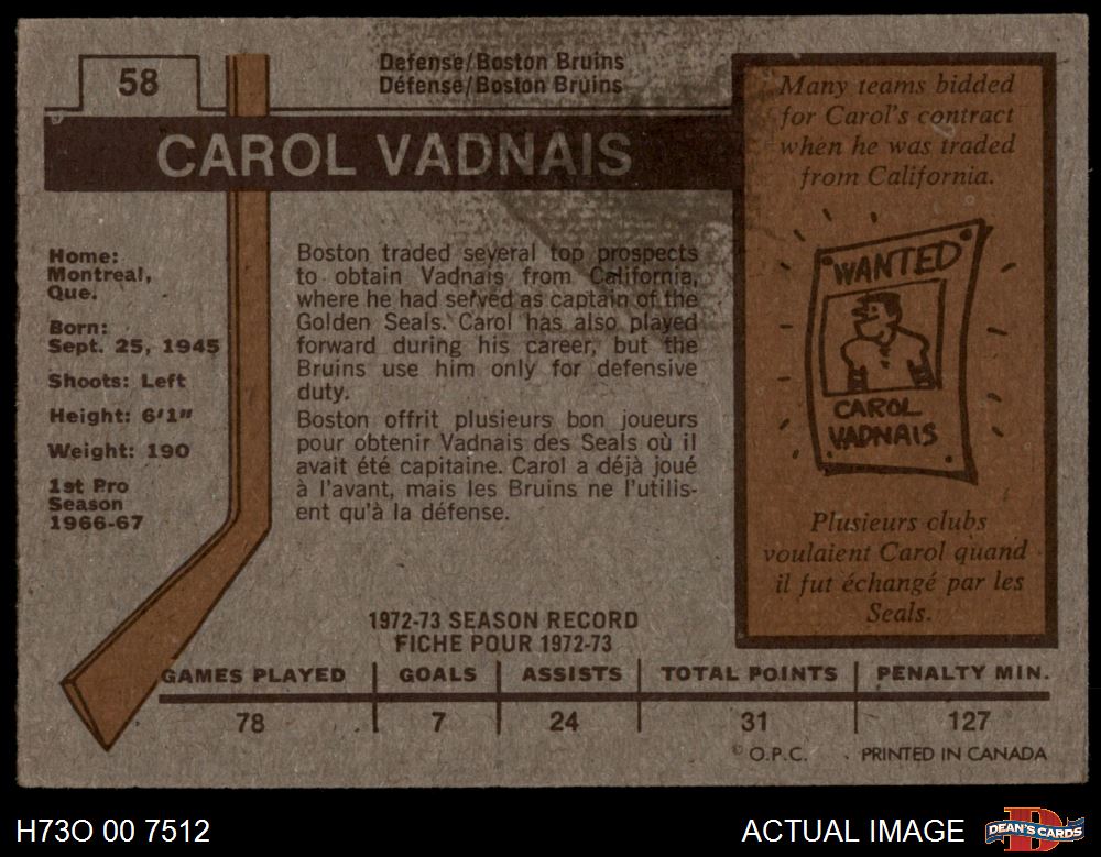 1973 O-Pee-Chee #58 Carol Vadnais 4 - VG/EX