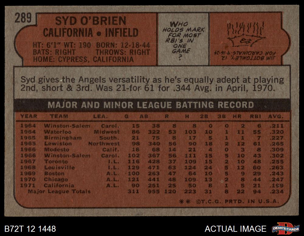1972 Topps #289 Syd O'Brien 6 - EX/MT