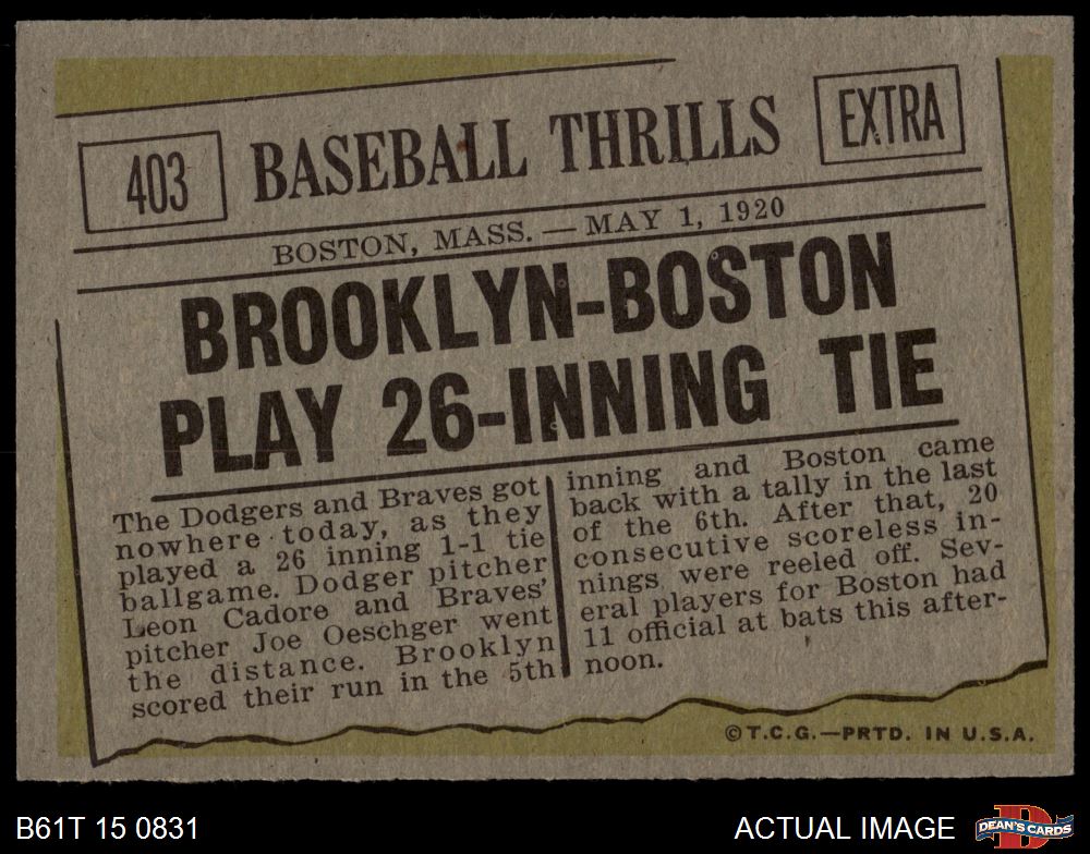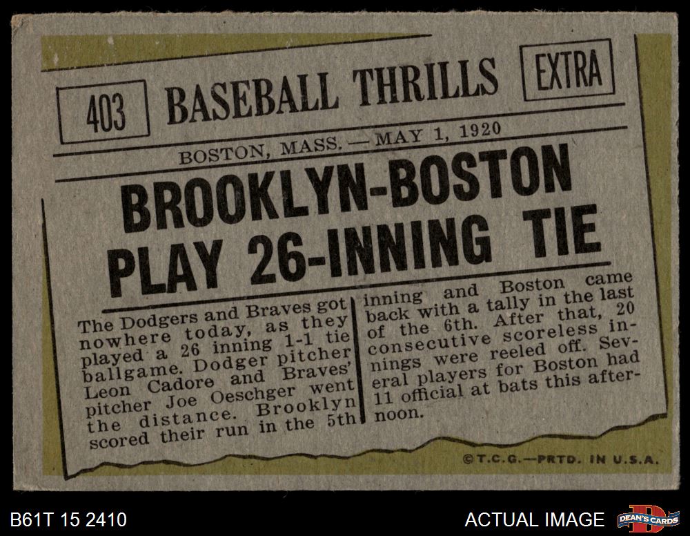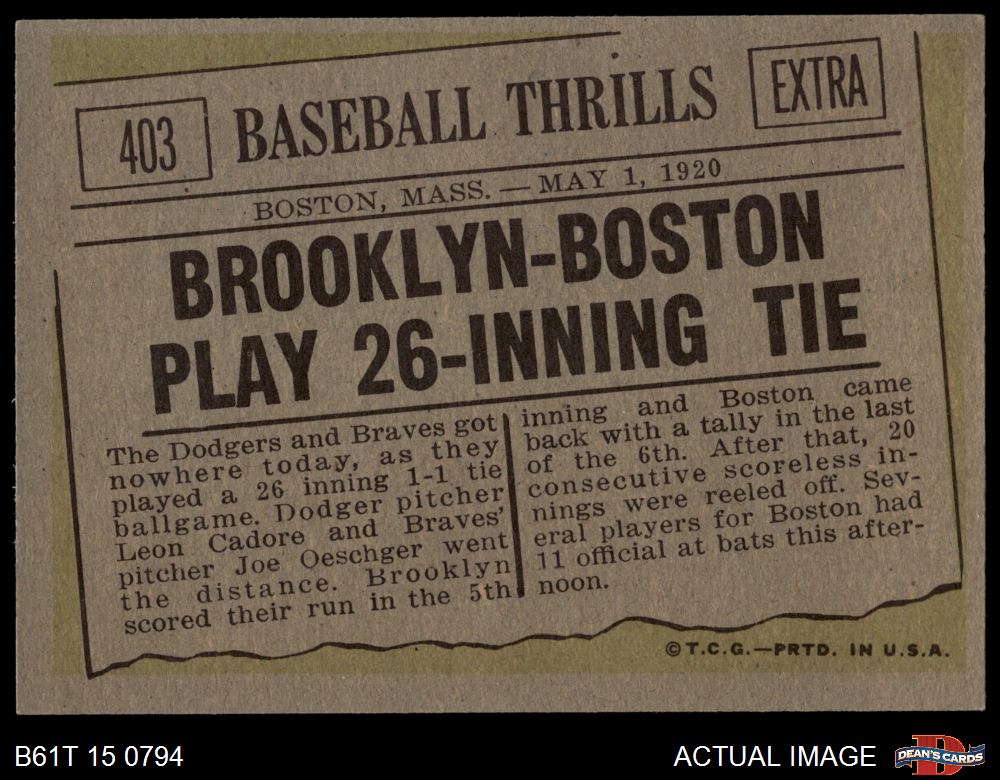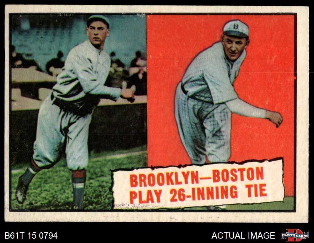 1961 Topps #403 Baseball Thrills - 26 Inning Tie