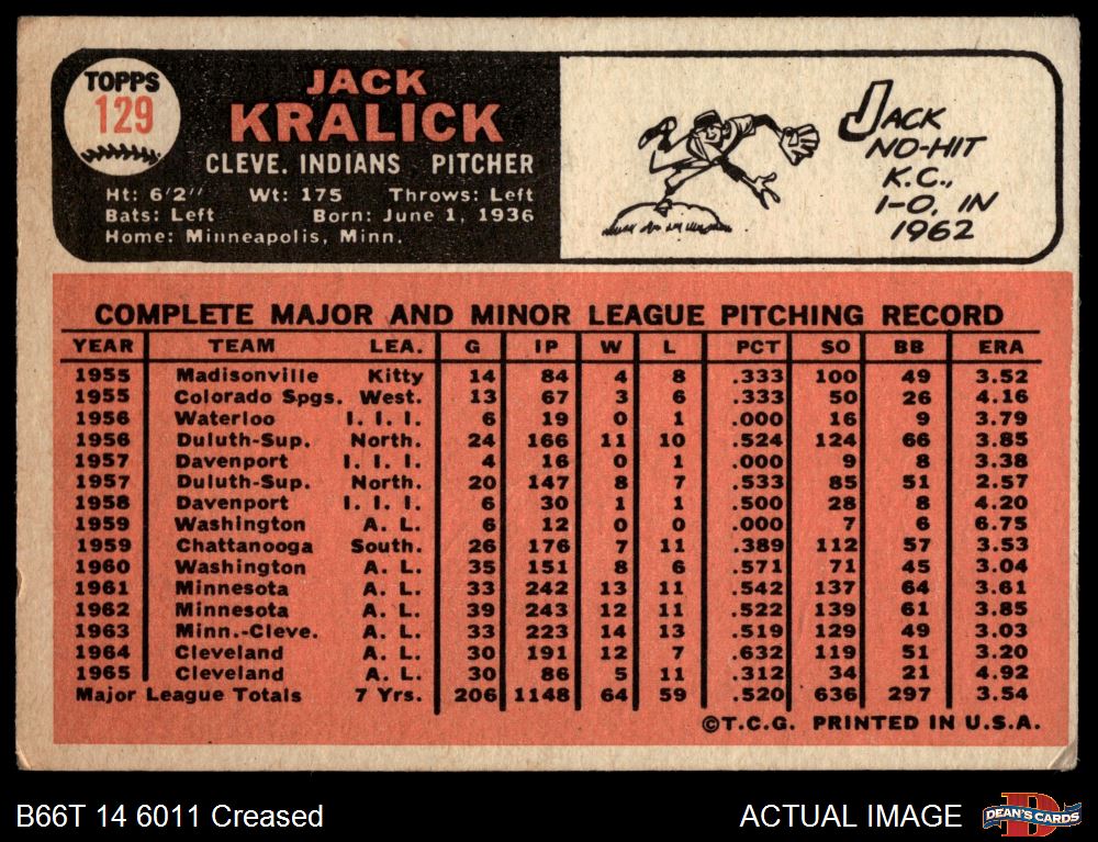 1966 Topps #129 Jack Kralick 2 - GOOD