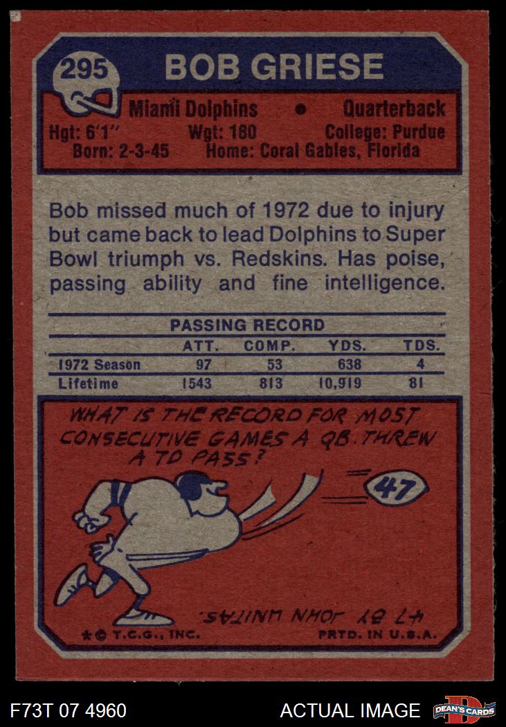 1973 Topps #295 Bob Griese 8 - NM/MT