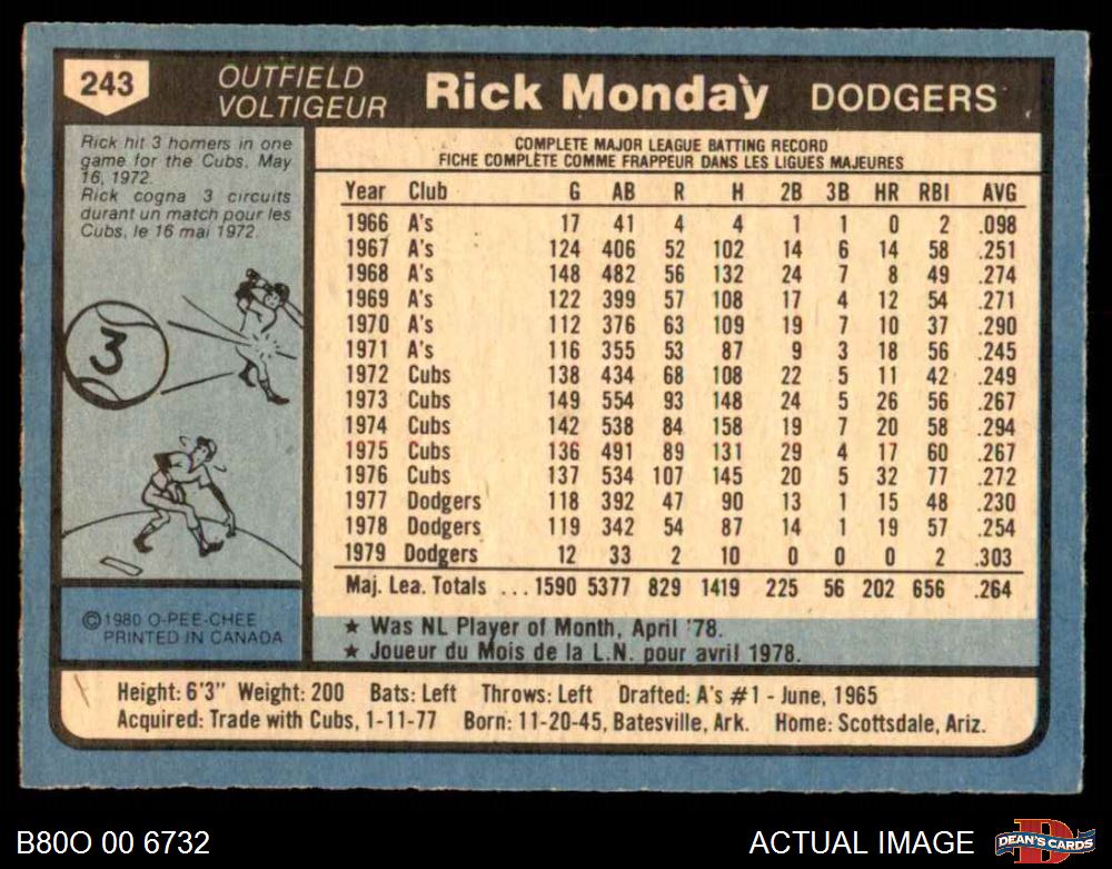 1980 O-Pee-Chee #243 Rick Monday 5 - EX