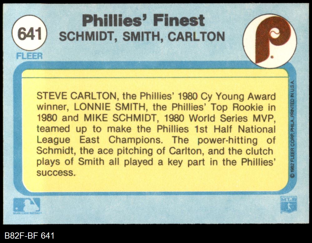 1982 Fleer #641 - Mike Schmidt / Lonnie Smith / Steve Carlton Phillies' Finest 8 - NM/MT
