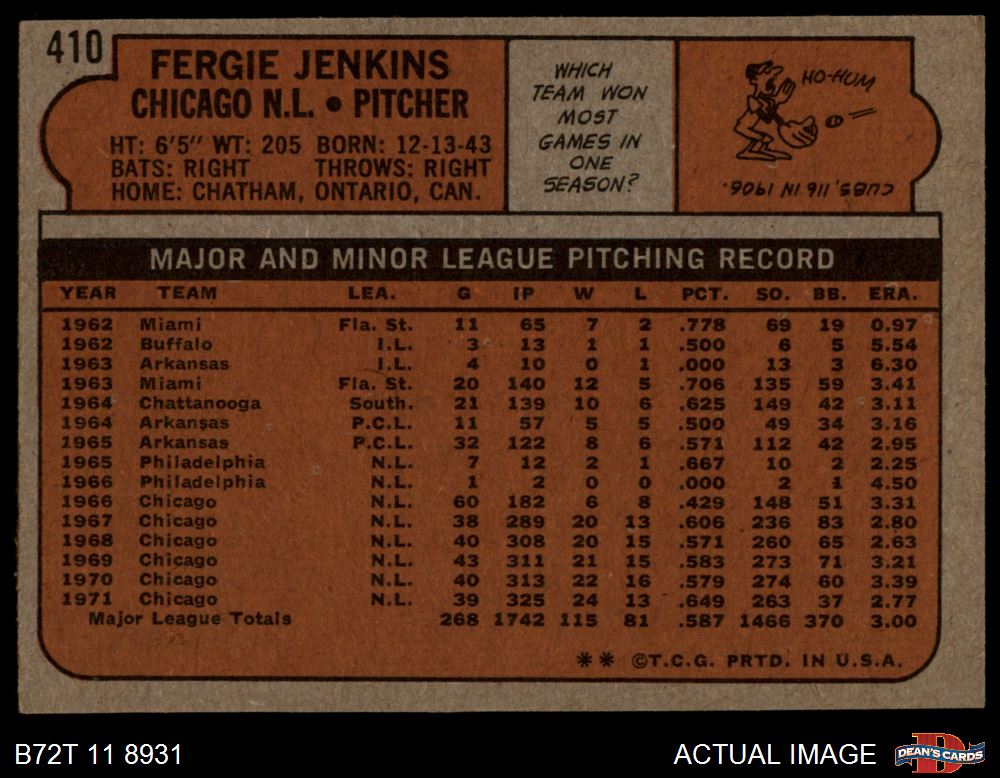 1972 Topps #410 Fergie Jenkins 4 - VG/EX