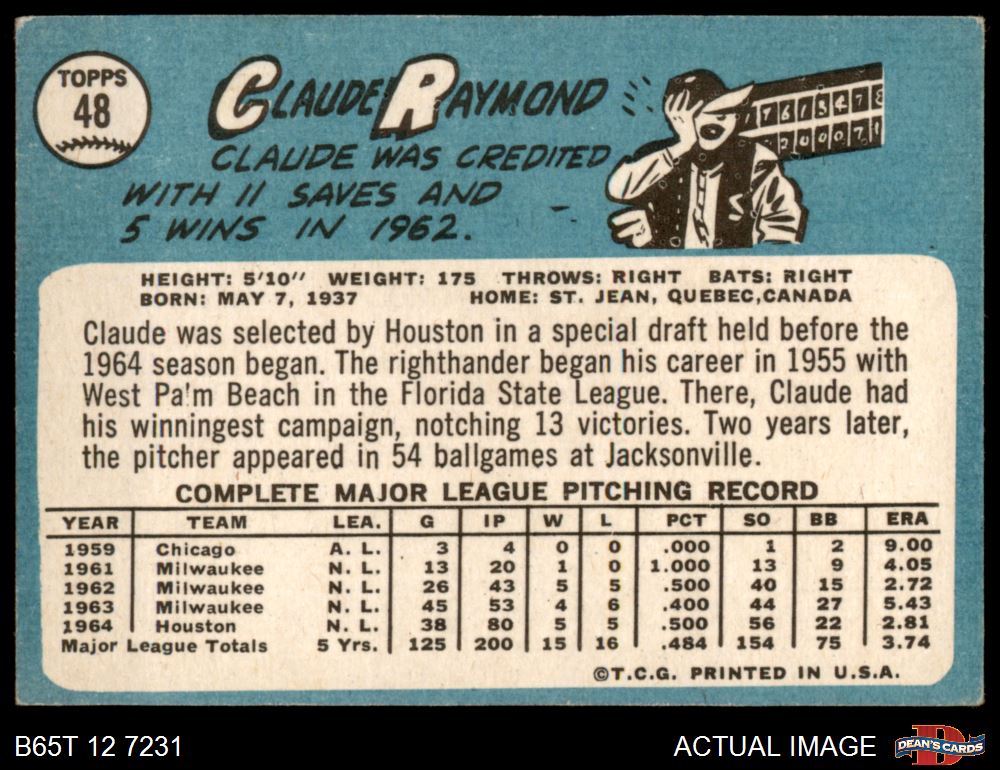 1965 Topps #48 Claude Raymond 3 - VG