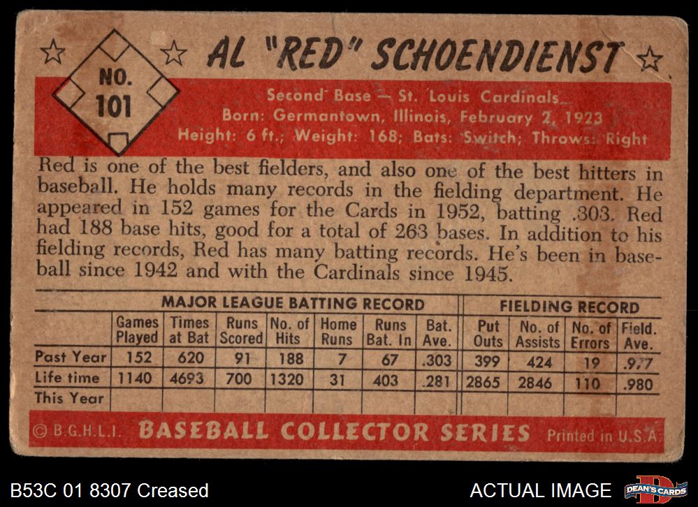 1953 Bowman #101 Red Schoendienst 1 - POOR