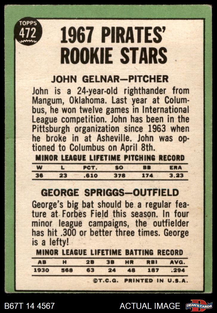 1967 Topps #472 - John Gelner / George Spriggs Pirates Rookies 1.5 - FAIR