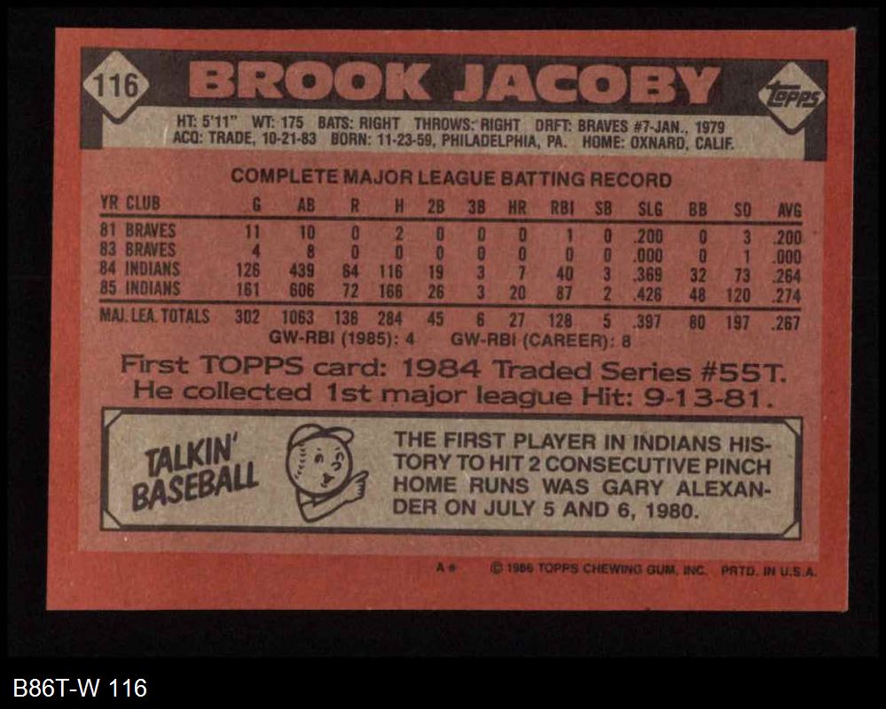 1986 Topps #116 Brook Jacoby 8 - NM/MT