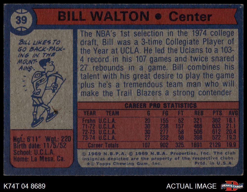 1974 Topps #39 Bill Walton 4 - VG/EX