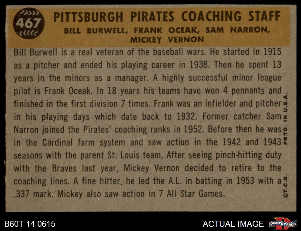 1960 Topps #467 - Bill Burwell / Frank Oceak / Sam Narron / Mickey Vernon Pirates Coaches 3 - VG