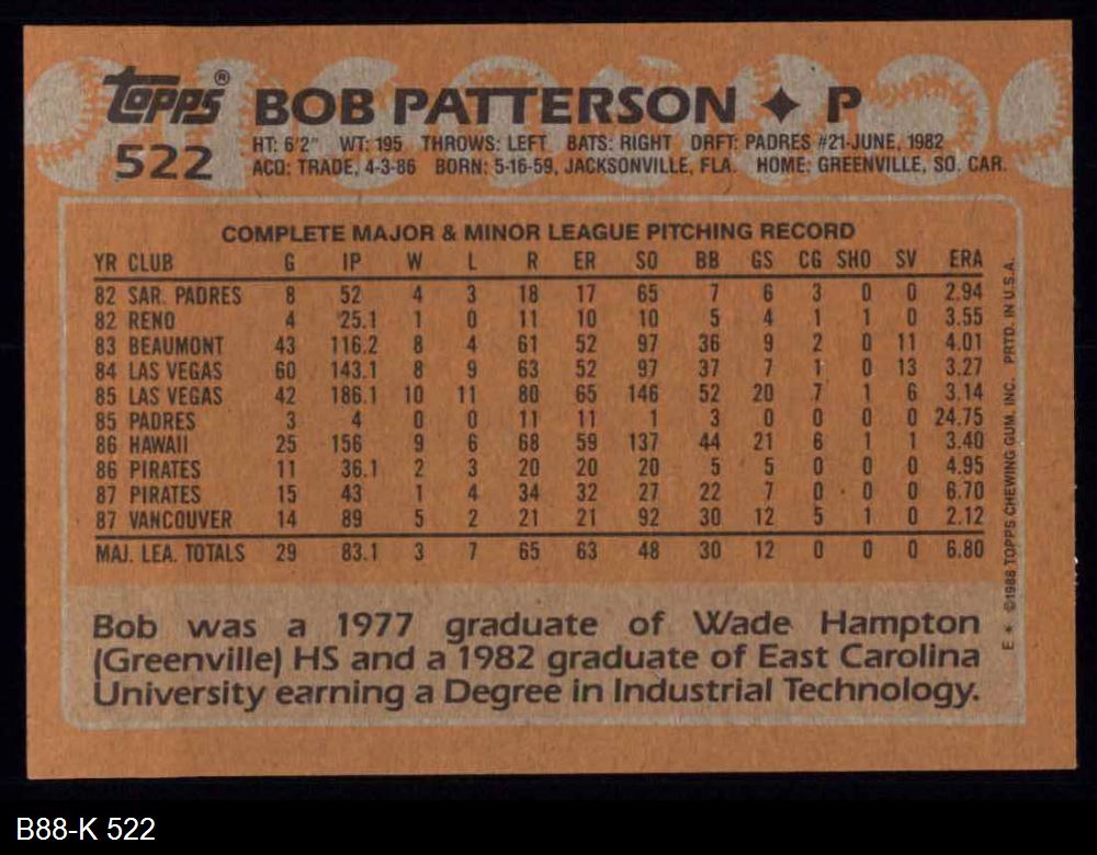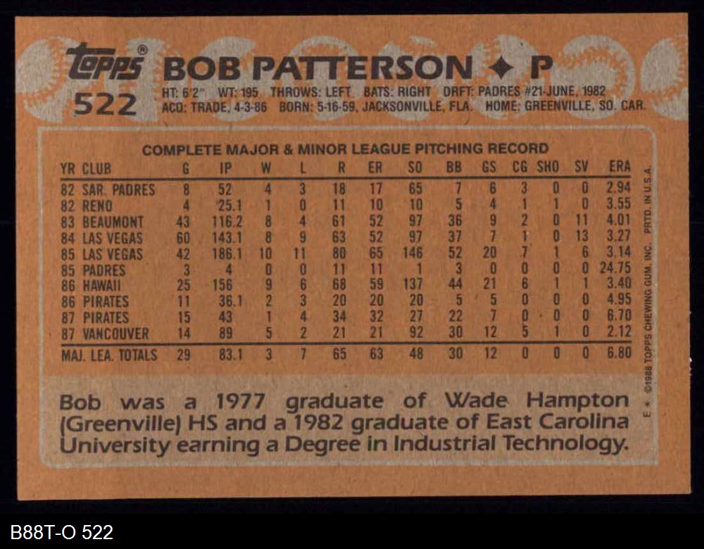 1988 Topps #522 Bob Patterson 8 - NM/MT