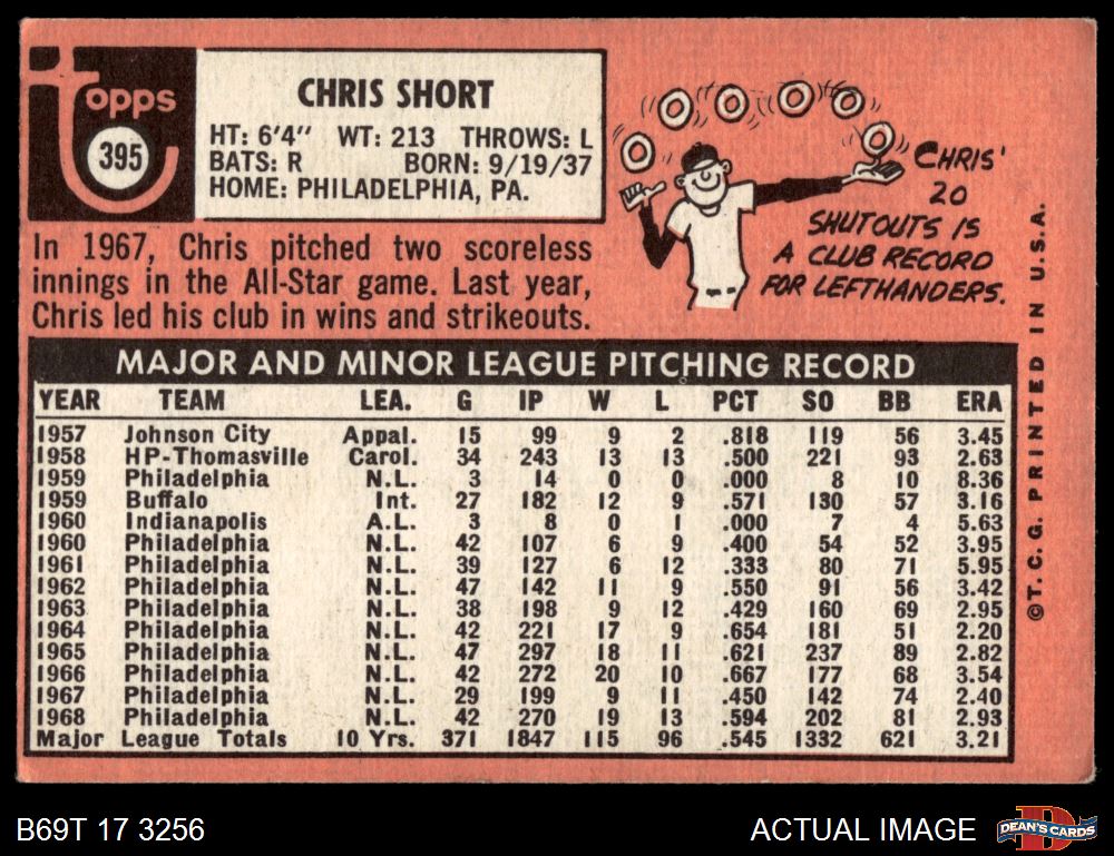 1969 Topps #395 Chris Short 3 - VG