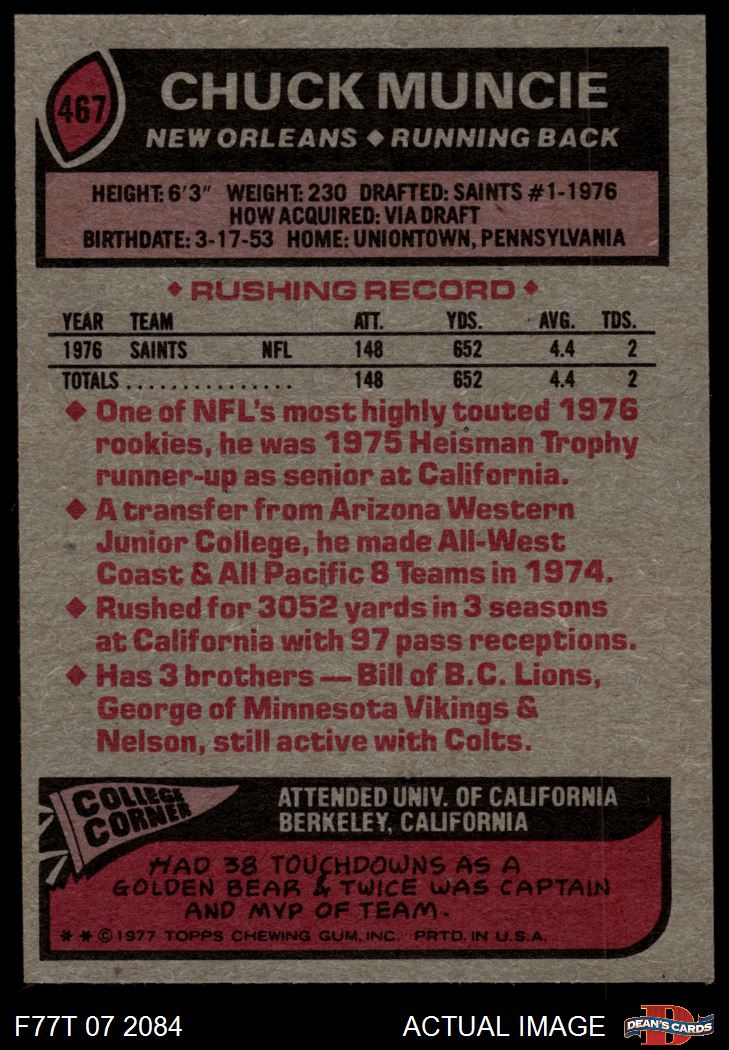 1977 Topps #467 Chuck Muncie 8 - NM/MT
