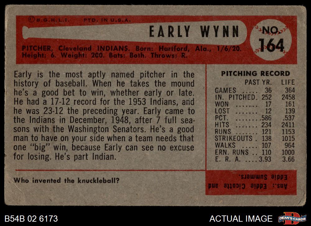 1954 Bowman #164 Early Wynn 2 - GOOD