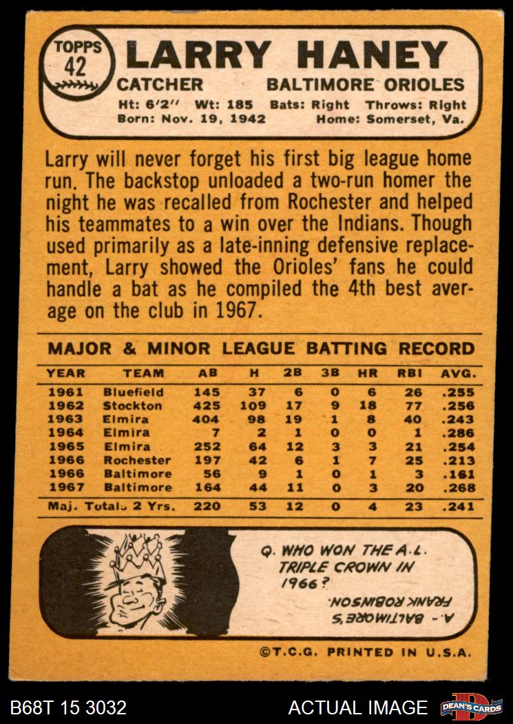 1968 Topps #42 Larry Haney 1.5 - FAIR