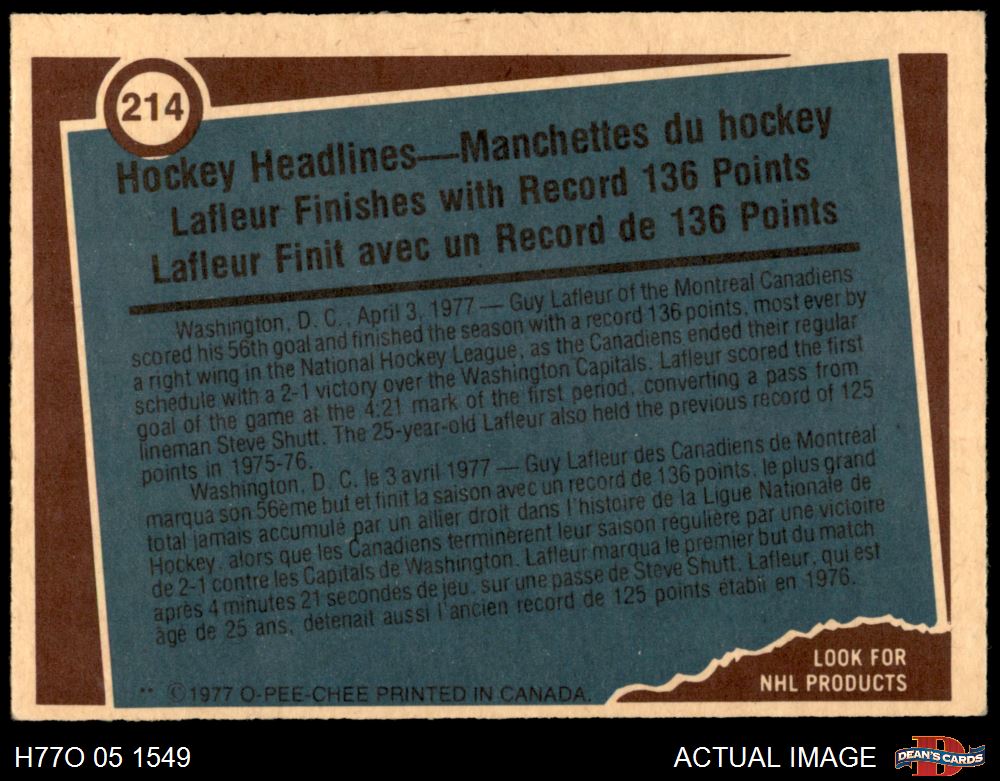 1977 O-Pee-Chee #214 - Guy Lafleur Record Breaker 6.5 - EX/MT+
