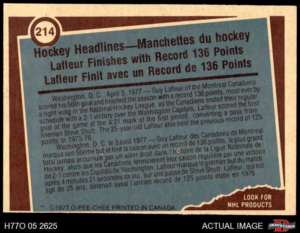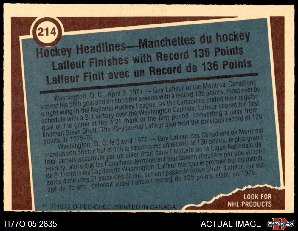 1977 O-Pee-Chee #214 - Guy Lafleur Record Breaker 7 - NM