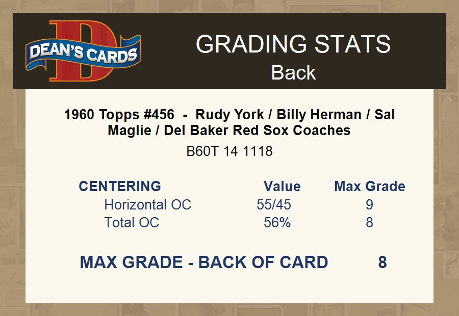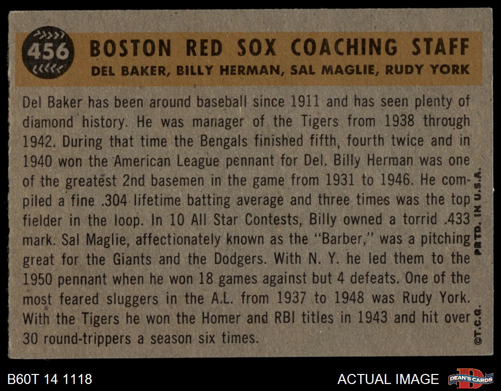 1960 Topps #456 - Rudy York / Billy Herman / Sal Maglie / Del Baker Red Sox Coaches 5 - EX