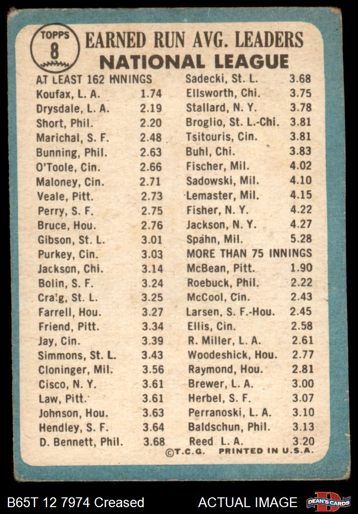 1965 Topps #8 - Sandy Koufax / Don Drysdale NL ERA Leaders 1 - POOR