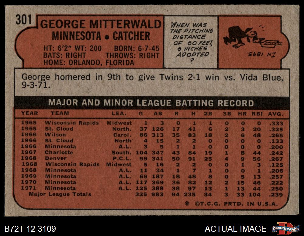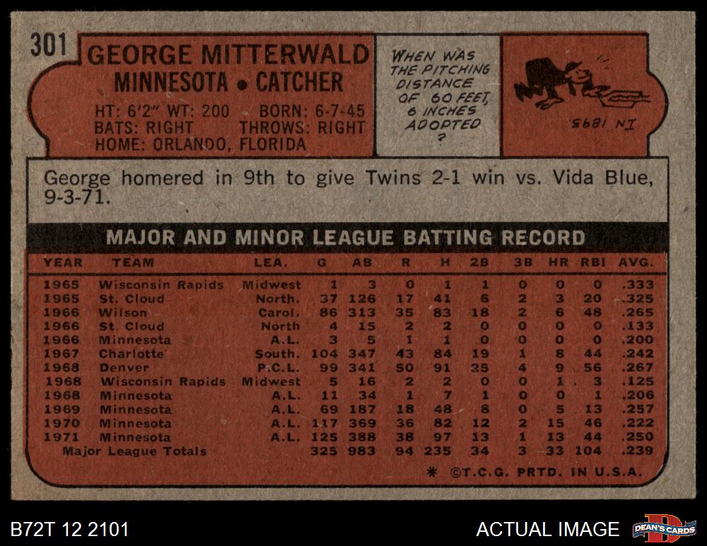 1972 Topps #301 George Mitterwald 3 - VG