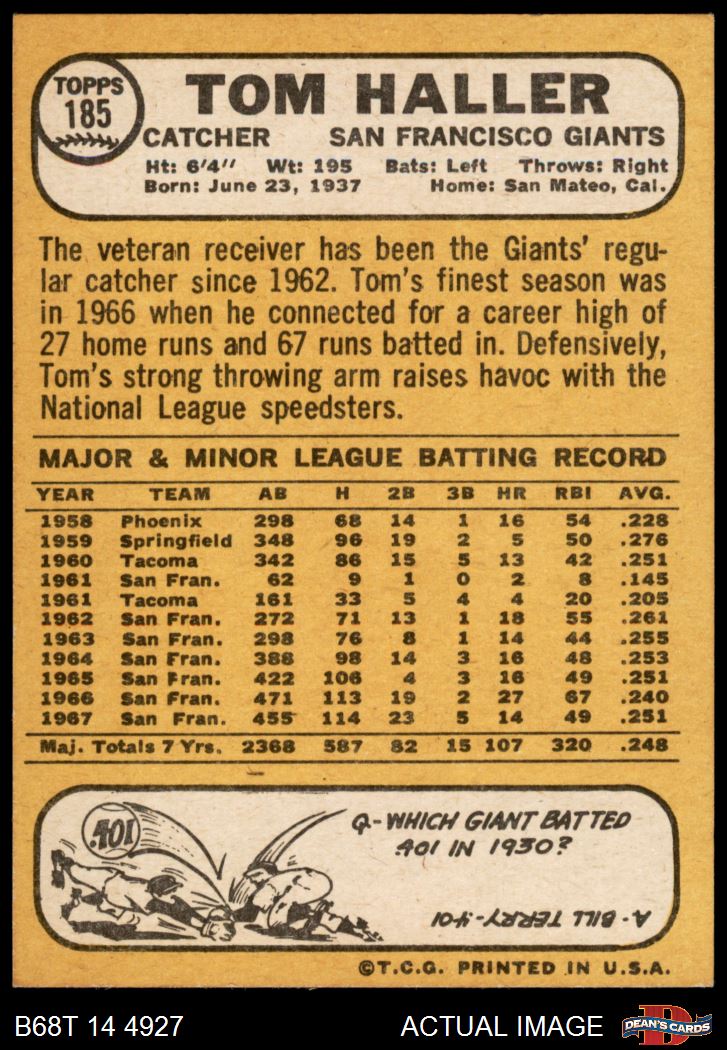 1968 Topps #185 A Tom Haller 7 - NM