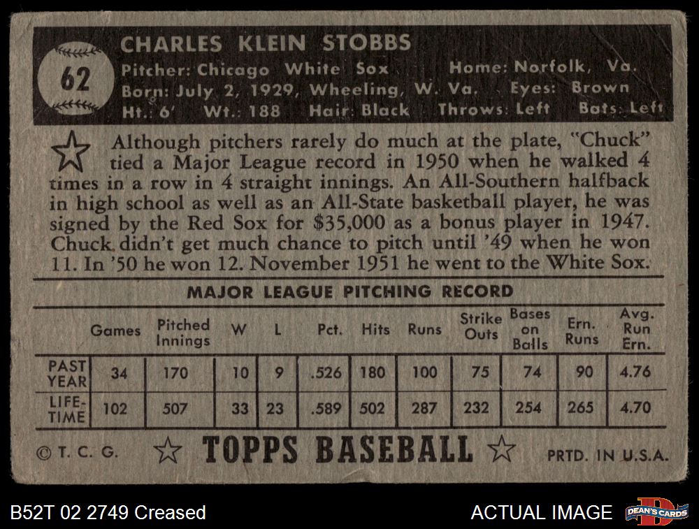 1952 Topps #62 Chuck Stobbs